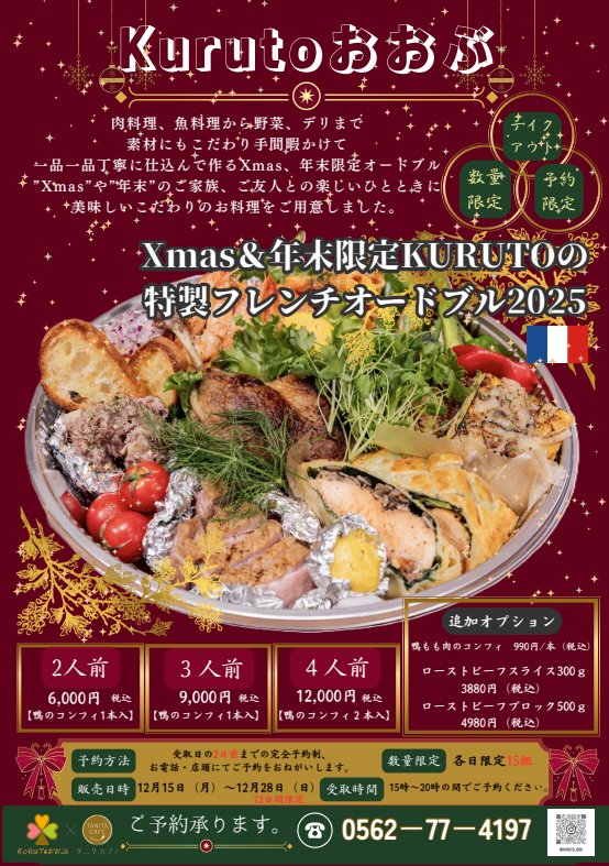 【題】Xmas&年末限定KURUTOの特製フレンチオードブル2025 肉料理、魚料理から野菜、デリまで素材にもこだわり手間暇かけて一品一品 丁寧に仕込んで作るXmas、年末限定オードブル。Xmasや年末のご家族、ご友人との楽しいひと時に美味しいこだわりのお料理をご用意しました。 各日先着順、数量限定となっております。 ▼受取日の2日前までの完全予約制 ▼日時 12/15 (月) ~12/28(日) ▼場所 KURUTOおおぶ ▼問い合わせ KURUTOおおぶ 0562-77-4197