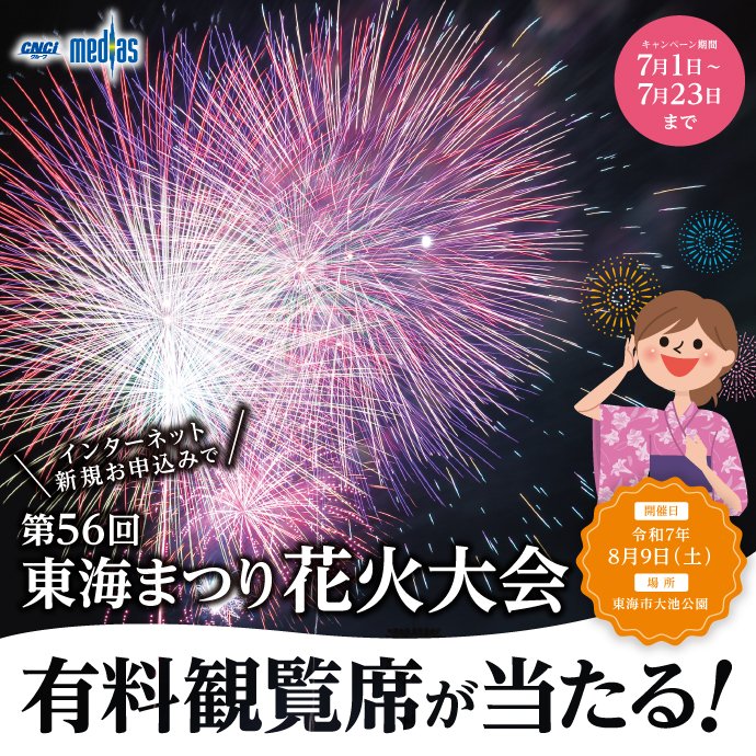 毎年大盛況の「東海まつり花火大会」。今年は約4,000発の大輪が夜空を彩ります。そんな特別な夜を、ゆったり有料観覧席で楽しめるチャンス! 7/1~7/23の期間中に、メディアスのインターネット・専門チャンネル・固定電話をご契約いただいた方の中から、抽選で25組様に有料観覧席をプレゼント! ネットも暮らしもアップデートしながら、夏の思い出も手に入れてみませんか? ーーーーーーーーーーーーーーーーーーーーーーーーーー キャンペーンは7/23終了しました。 沢山のご応募ありがとうございました。