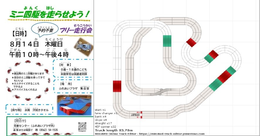 夏休み特別企画 ミニ四駆を走らせよう! 愛知県 知多市児童センター 持参ミニ四駆走行可能 カスタムして走らせよう 貸し出しミニ四駆があるので、ミニ四駆を持っていなくても遊べます 10時~16時 予約不要 9月14日(日)東海市太田川駅前イベント広場大屋根広場 ミニ四駆レース大会に参加する改造ミニ四駆をカスタムしても良いです 通常 午前製作体験 午後フリー走行 と開催していますが 今回は終日フリー走行です