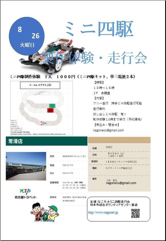 「名古屋トヨペット常滑店」 8月26日(火) 10時~16時 2F 会議室 ミニ四駆製作体験 ミニ四駆走行会 貸し出し有り 自作ミニ四駆持ち込み走行可能 フリー走行 無料