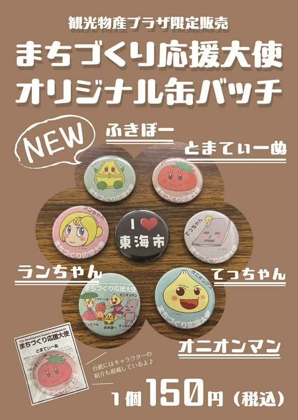 東海市観光物産プラザ限定販売で まちづくり応援大使のオリジナル缶バッジを販売します♪ 直径44mmのつけやすいサイズの缶バッジです☆ ぜひ、お土産に、プレゼントに、自分用にご利用ください♪