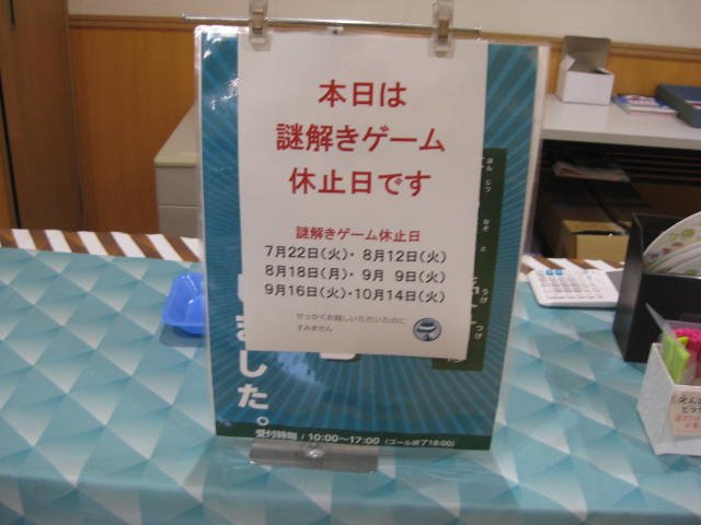 謎解きゲームは10月19日までの開催となっておりますが、実はこの期間中の 7/22(火)・8/12(火)・8/18(月)・9/9(火)・9/16(火)・10/14(火) の6日間は、謎解きゲームの休止日となっております。 お間違えの無いようお願い致します そして、もう一つ。先着1500名様となっており、定員になり次第終了となります。 と、言ってもゲームはスタートしたばかり!! 定員になるにはまだまだ皆様のご協力が必要です(^_-)-☆ 多くの方のご参加をスタッフ一同お待ちしております