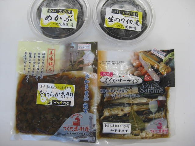 今日も暑い一日になっています 暑さで食欲が無くても調理要らず 【つくだ煮街道の商品】をご紹介いたします 愛知豊浜産めかぶ・・・・・(税込)650円 南知多産生のり佃煮(生のり80%使用)・・・・・(税込)650円 やわらかあさり(お茶漬け・おにぎりにもオススメです)・・・・・(税込)650円 和風オイルサーディン(サラダにもおススメです)・・・・・(税込)650円 にしん蒲焼(にしんそばにもおススメです)・・・・・(税込)750円 とろさば蒲焼(骨まで食べれます)・・・・・(税込)650円 南知多豊浜産真いわしの甘露煮・・・・・(税込)650円 ご賞味ください