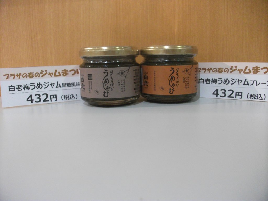 明日からいよいよ「プラザ春のジャムまつり」がスタート! 今日はこちらご紹介します! 常滑の酒蔵澤田酒造さんの 白老梅 梅ジャム プレーンと黒糖風味 日本酒で漬けた梅酒 「白老梅の梅を実」 を使った無添加のジャムです。 国産原料にこだわった ほんのり梅酒の香りがするジャム。 アルコール分は残っていないので 安心してお召し上がりいただけます。 お料理の隠し味にもご活用ください! ジャムまつり期間中 対象ジャムを2個以上のお買い上げで メッシュトートバックプレゼント!先着30名様限定です 知多半島の美味しいジャム、お気に入りを見つけてくださいね♪