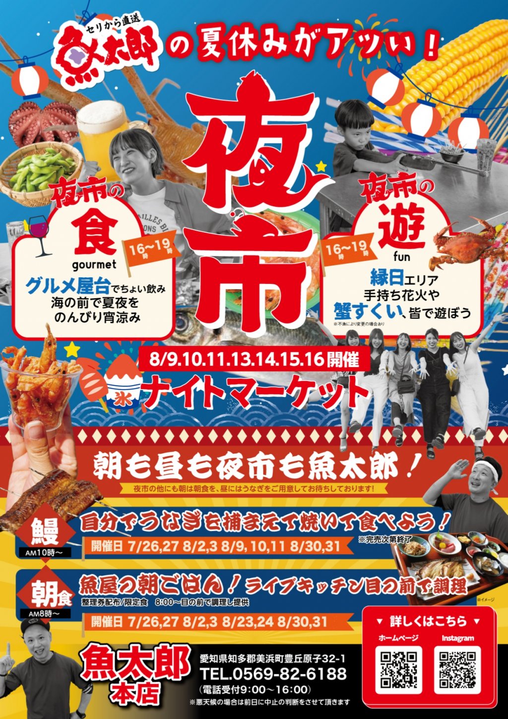 イベント終了 注意:屋外イベントの為、悪天候時は前日に中止の判断を致します。公式Instagramにて発表します 残念ながら 8/10.11.13雨天中止となりました。 ●グルメ屋台 ●縁日屋台など 夕方から、海の真ん前で過ごす、お祭り気分なイベントです。 浜焼きBBQのシェフが作る ピンチョス お酒と一緒に 鮮魚市場の茹でタコや 茹でたて海老が お手軽サイズで 茹でたてが食べれたり 旨いもの屋台の限定商品、あさりカレー 魚太郎本店の4つの店舗のいいとこどりが、気楽に楽しめる屋台です!