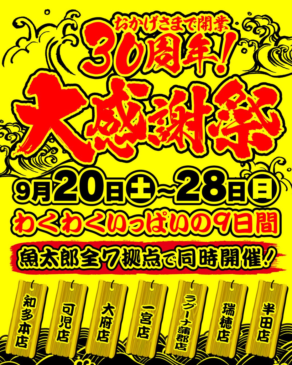 【期間】9/20(土)~9/28(日) わくわくいっぱいの9日間 魚太郎全7拠点で同時開催 ◎感謝特売 (鮮魚市場6店舗対象) 自家製干物やエビに蟹、まぐろも!感謝価格で大放出!! ◎感謝の\福引会/ 全店舗でご利用のお客様に福引きをお渡し! 特賞はなんと!水槽から活きた真鯛をすくう!(刺身用に調理します)※水槽のない店舗は活きた伊勢海老! ◎感謝メニュー 各飲食施設ごと ・デラックス海鮮丼/海鮮丼屋台 ・こぼれ増し増し軍艦/回転鮨 ・ガンガン焼き詰め放題/浜焼きBBQ ・生ビール300円 各店 ◎じゃんけん大会(鮮魚市場6店舗対象)毎日11.13.15時に開催