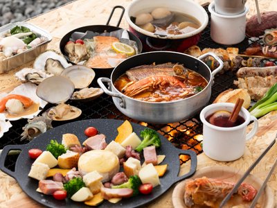 魚太郎BBQは、年中無休! もちろん秋も冬もお任せ下さい! 魚太郎浜焼きバーベキューは 『予約なしOK』『準備なしでOK』『片付け一切なし』『雨天OK』と自由度が高く、いつでも簡単に本格BBQが海の前で出来ますよ! 炭火を囲んで過ごす席が増設されました!(11月下旬~)驚くほどあったかい~! チーズフォンデュやアヒージョ、ブイヤベース、おでん、熱燗、ホットワイン、ホットチョコなどなど、季節ごとに色んなメニューが登場してます! 何も準備はいりません、お店に来て約80種の好きな食材からチョイスしたら、もうBBQのはじまり! 秋こそ冬も、外で過ごす時間は、楽しさで溢れてる!