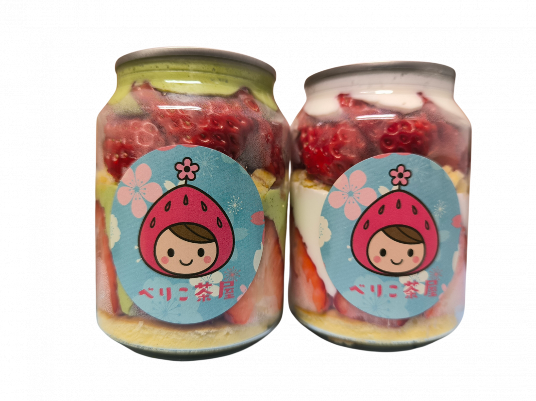透明容器(缶型カップ)に、いちご、あずき、抹茶クリームが層状に入った冷凍スイーツです。