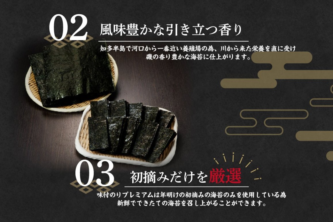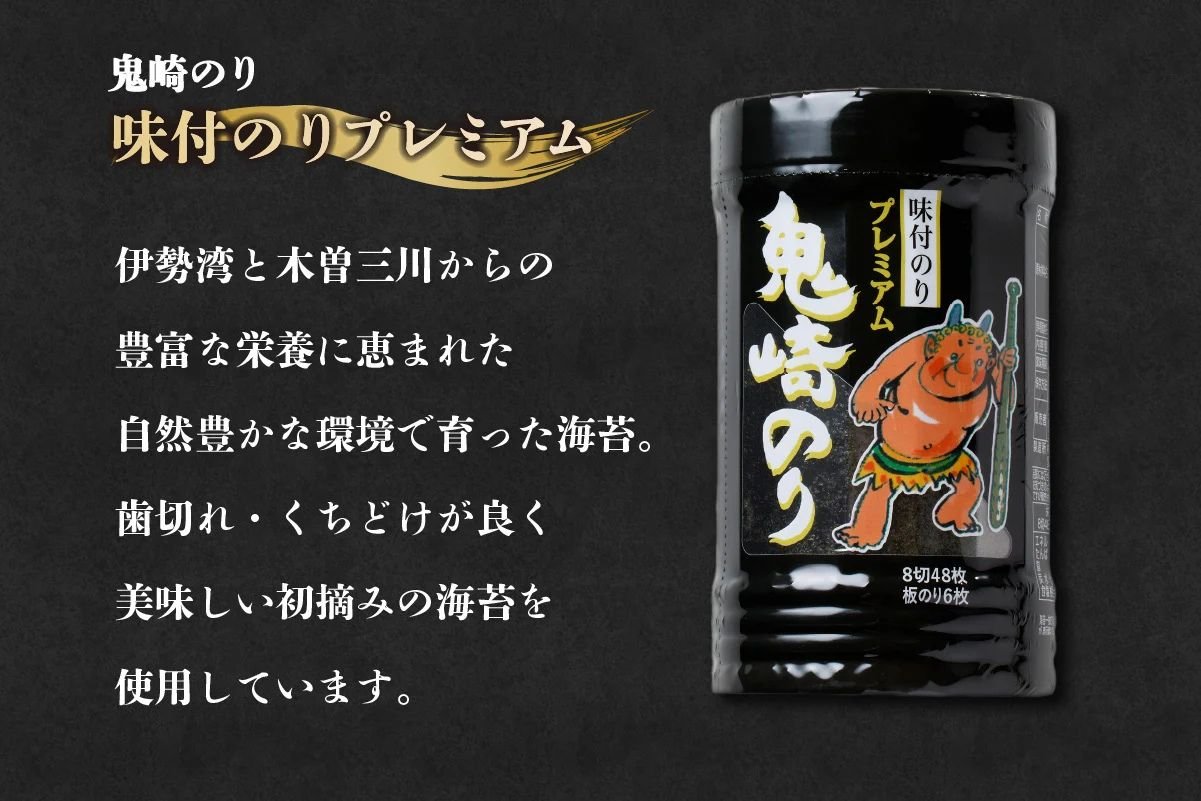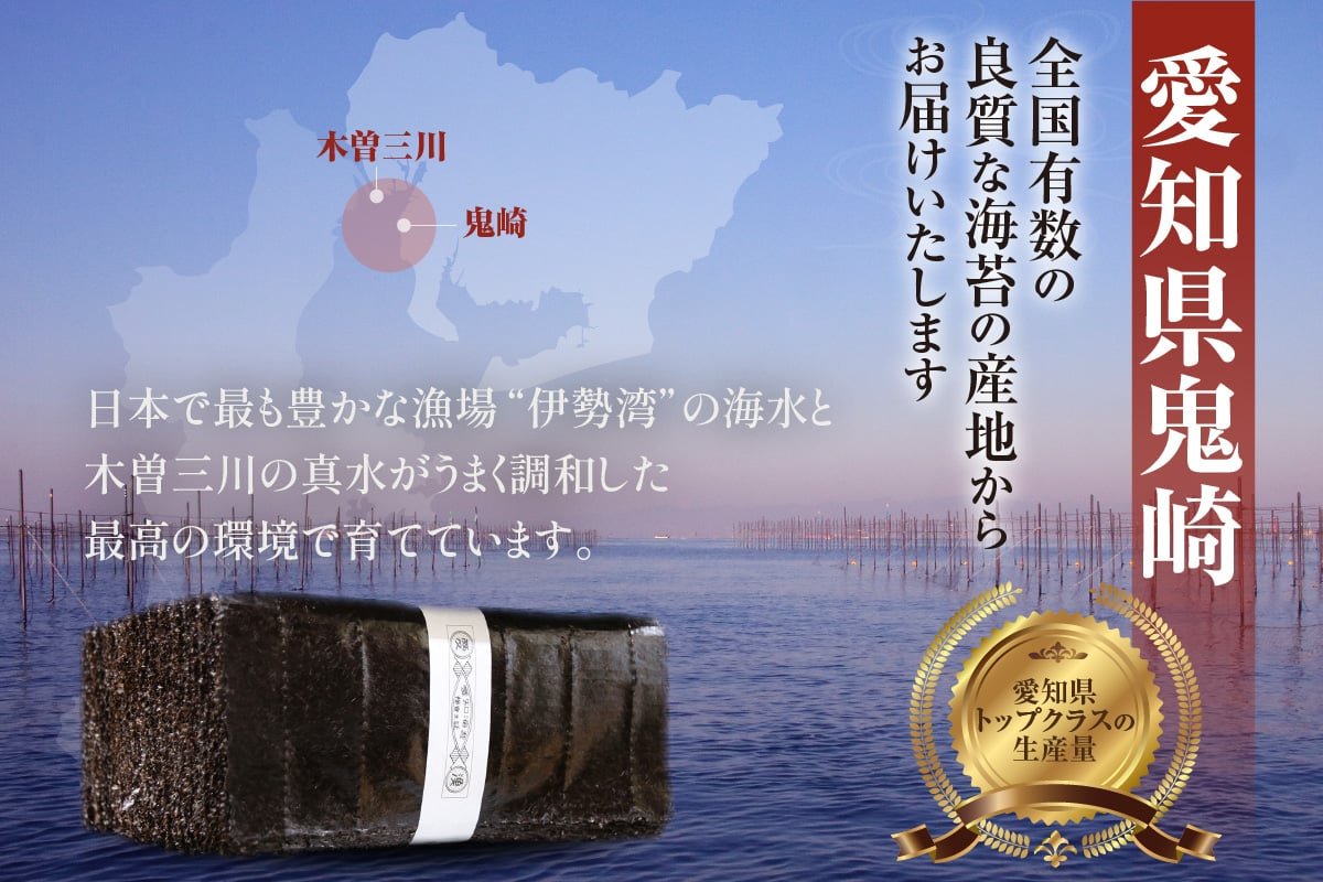 伊勢湾と木曽三川からの豊富な栄養に恵まれた鬼崎のり。味付のりは歯切れ・口どけがよく、美味しい初摘みの高級海苔を使用しています。
